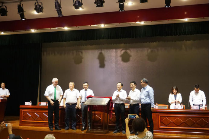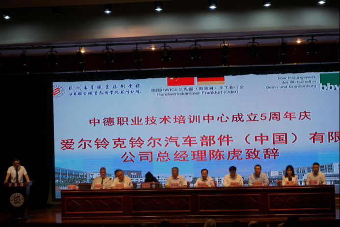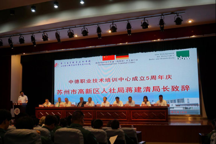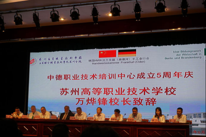 6月18日上午9点,,,苏州高等职业技术学校大礼堂内嘉宾满堂,,中德职业技术培训中心成立5周年庆暨德国HWK考试中心及中德高新区现代学徒中心揭牌仪式正式举行。。。