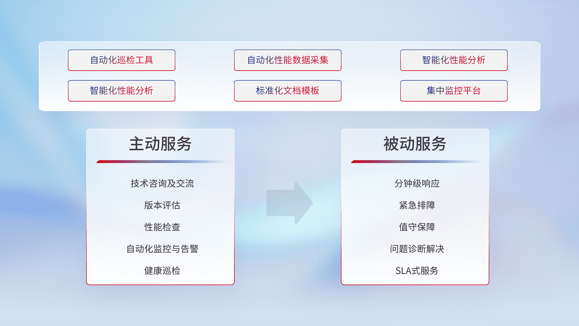 智能化工具和标准化文档,,保障服务质量,,提供主动服务(包含技术咨询、、版本评估、、性能检查、、、、自动化监控与告警、、、健康巡检)和被动服务包含(分钟级响应、、、、紧急排障、、、、值守保障、、、问题诊断解决、、SLA服务)。。
